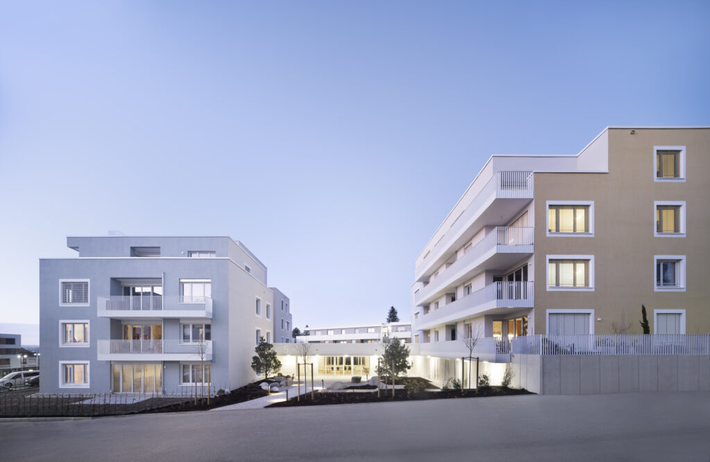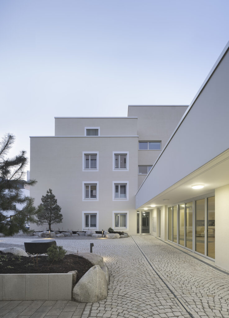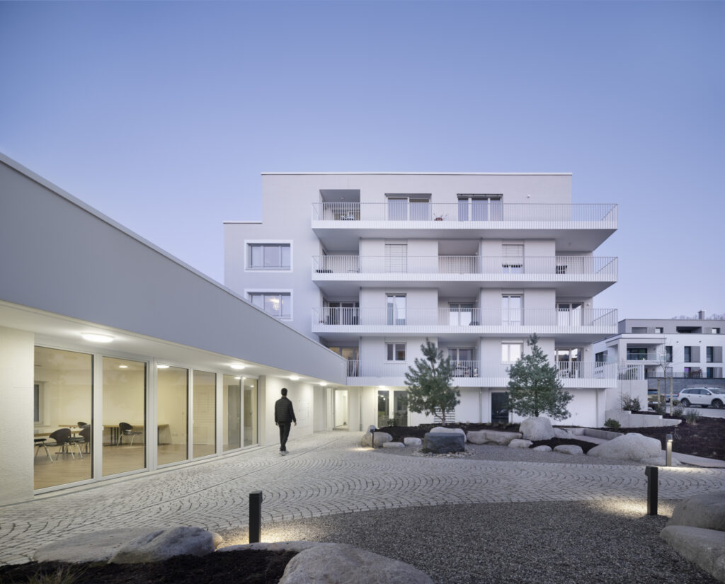 Das Mehrgenerationenhaus mit 26 Wohnungen besteht aus zwei Gebäuden, die um einen Hof angeordnet sind. Sie werden durch einen eingeschossigen Gemeinschaftstrakt und eine überdachte Vorzone verbunden. Die Wohnungen wurden in verschiedenen Größen von 2 bis 5 Zimmern geplant, darunter auch Clusterwohnungen mit kompakten privaten Bereichen und großzügig geteilten Küchen- und Wohnräumen, die Flächen sparen und Wohnkosten senken. Ein klares Grundriss- und Tragwerkskonzept mit geringen Deckenspannweiten und die innenliegende Zone mit Sanitärräumen waren eine stringente Vorgabe für die ansonsten freie Grundrissgestaltung mit nichttragenden Wänden. Das Projekt wurde als KfW-Effizienzhaus 40 realisiert.