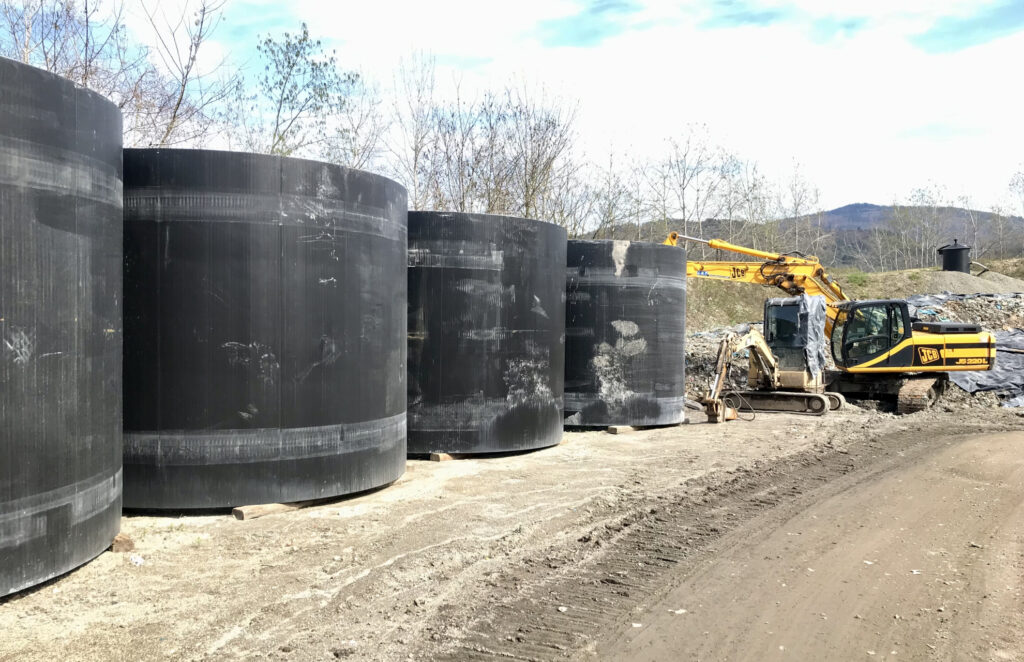 Auf der Deponie Scheinbarg war die Sanierung des Entwässerungssystems erforderlich, im Zuge dessen ein neuer Deponieschacht zu bauen war. Hierfür wurde zunächst eine Baugrube senkrecht im bestehenden Deponiekörper bis zu einer Tiefe von 37 m abgeteuft und durch einen Spritzbetonverbau gesichert. In der Baugrubensohle wurde dann ein kreisrundes Stahlbetoneinzelfundament hergestellt, auf dem anschließend ein Deponieschacht in Fertigteilbauweise errichtet wurde. Der Ringraum zwischen Deponieschacht und Spritzbetonverbau wurde mit geeignetem Aushubmaterial aus dem Abfallzwischenlager verfüllt.