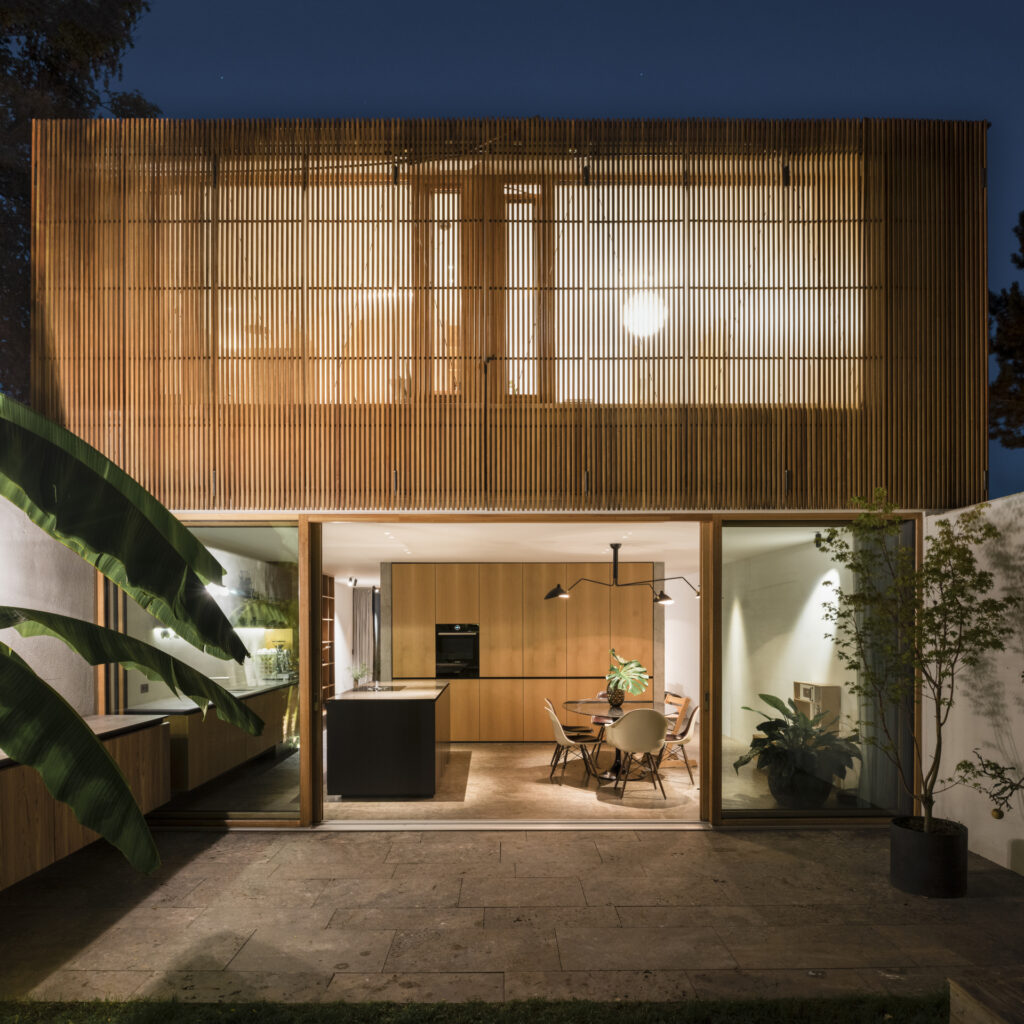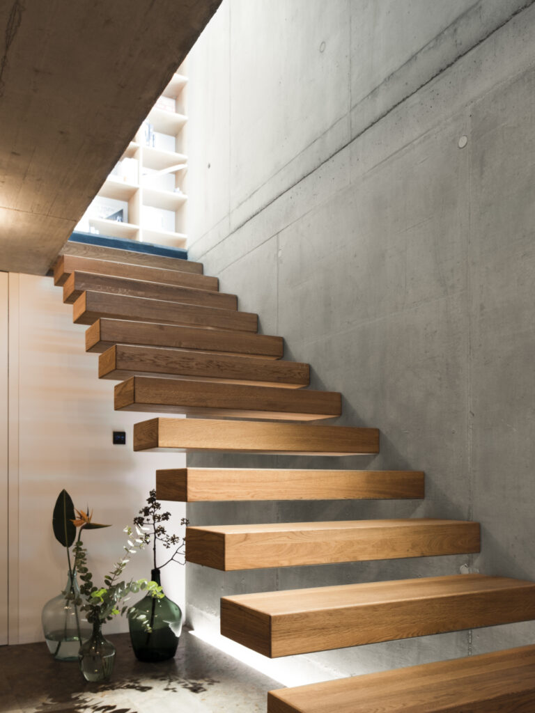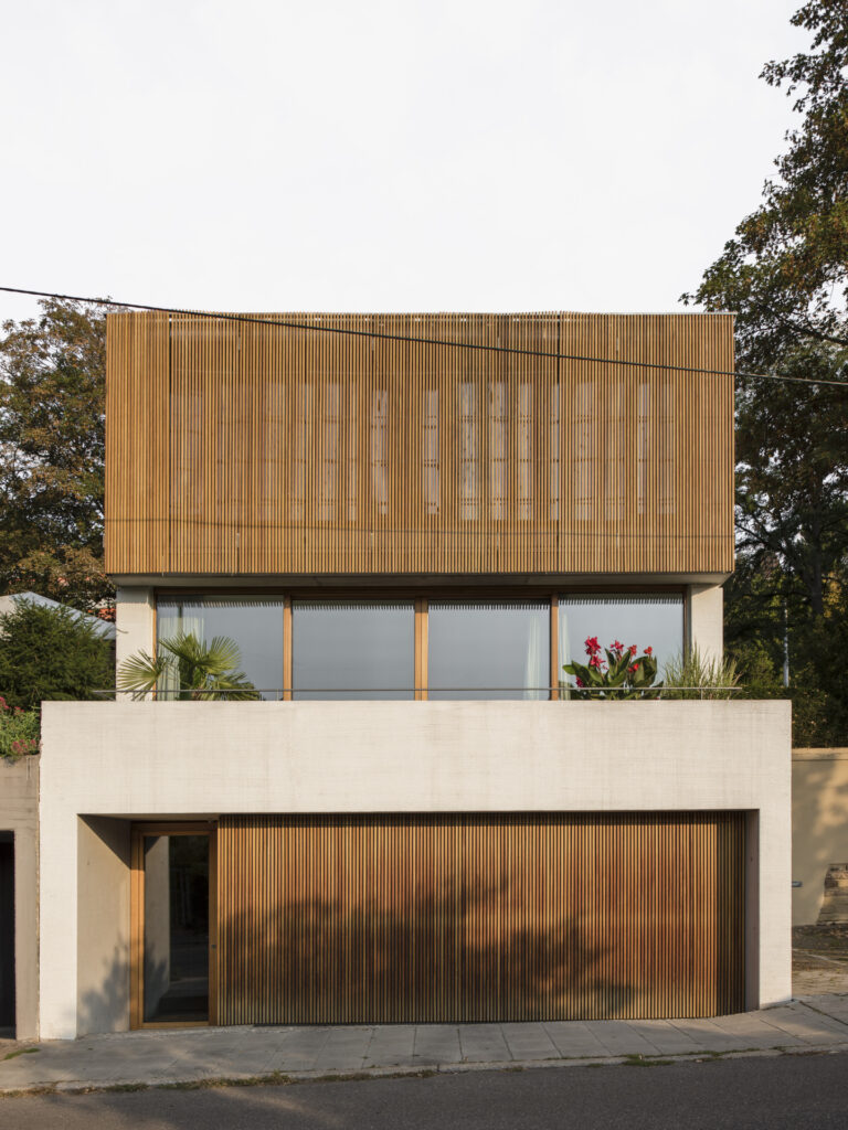 Über dem Untergeschoss mit Garage und Kellerräumen befinden sich die mit offenen Treppen verbundenen Wohn- und Schlafebenen, um einen offenen Stahlbetonkern gruppiert. Die Ausführung nahezu aller Betonbauteile in höchster Sichtbetonqualität erforderte entsprechende Schal- und Bewehrungsplanung mit Berücksichtigung sämtlicher Installationen. Zu den Straßenseiten bietet eine Holz-Lamellenfassade mit beweglichen Elementen Sichtschutz und ermöglicht trotzdem Blickbeziehungen.