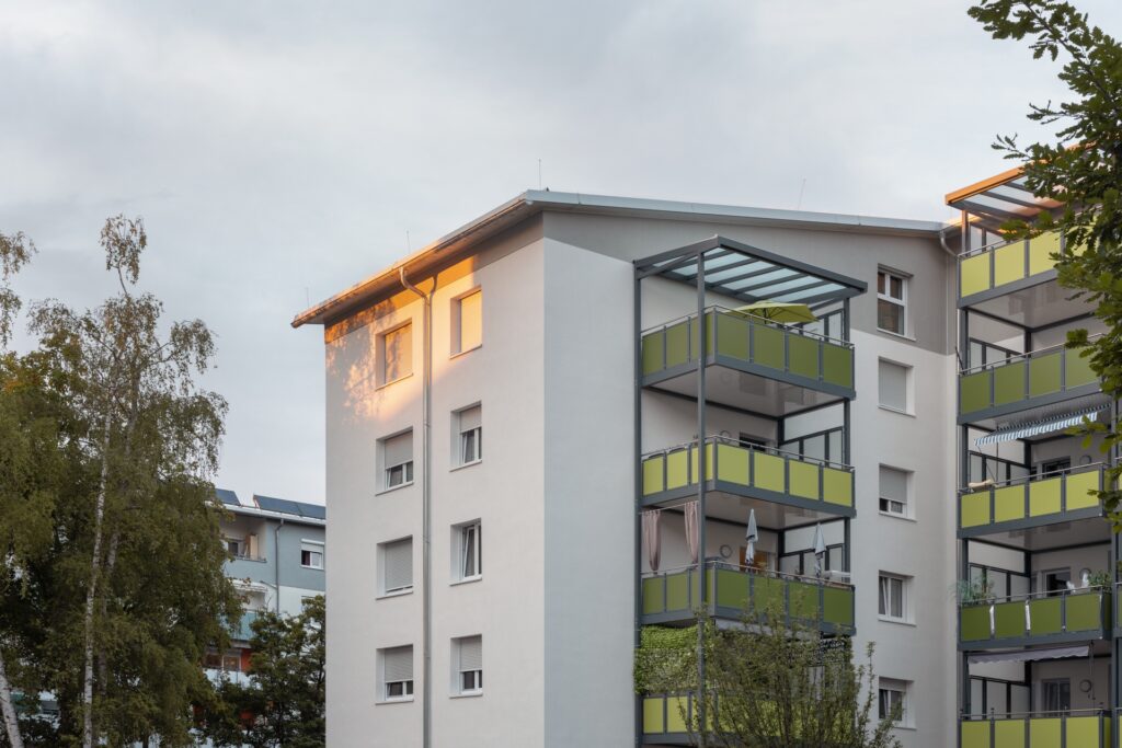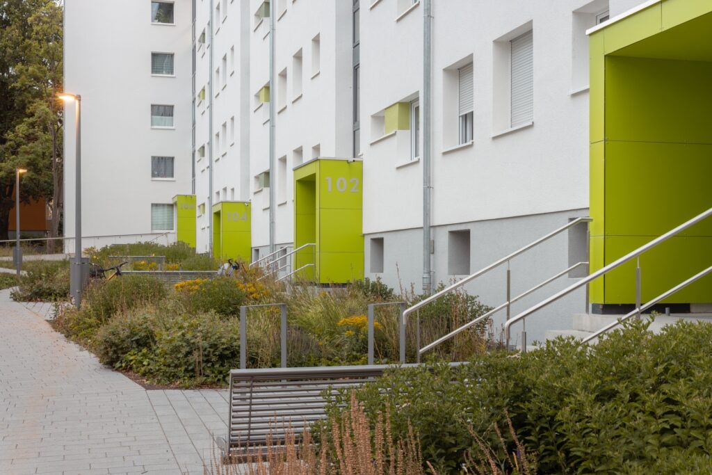 Die Sanierung erfolgte über zwei Bauabschnitte, so dass die Wohnungen nach der Sanierung neu vermietet und neu bezogen werden konnten. Als Maßnahmen wurden geplant und ausgeführt: Erweiterung Dachgeschoss, neuer Aufzug (die Gründung erfolgte auf einem bestehenden Tiefgaragenneubau), neue Aluminium-Fertigbalkone (Gründung mit duktilen Gusspfählen), attraktivere Grundrisse in den Kopfbauten, verschiedene Kleinarbeiten und neue Hauseingänge.